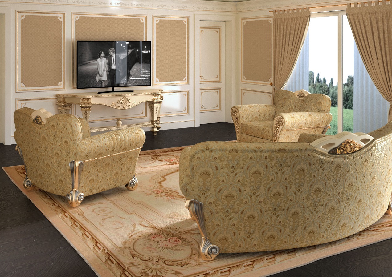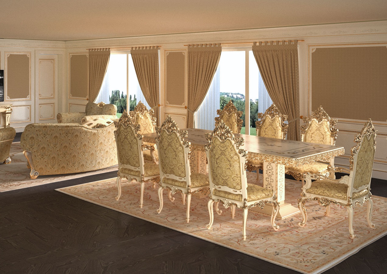 L’area living si apre su uno spazio di grande prestigio con il divano e le poltrone Charme, incorniciate da boiserie raffinate e dalle loro sedute avvolgenti che donano il massimo comfort. Proseguendo con la zona pranzo troviamo il tavolo Luci della Ribalta che si impone per la sua maestosità e la qualità dei materiali.