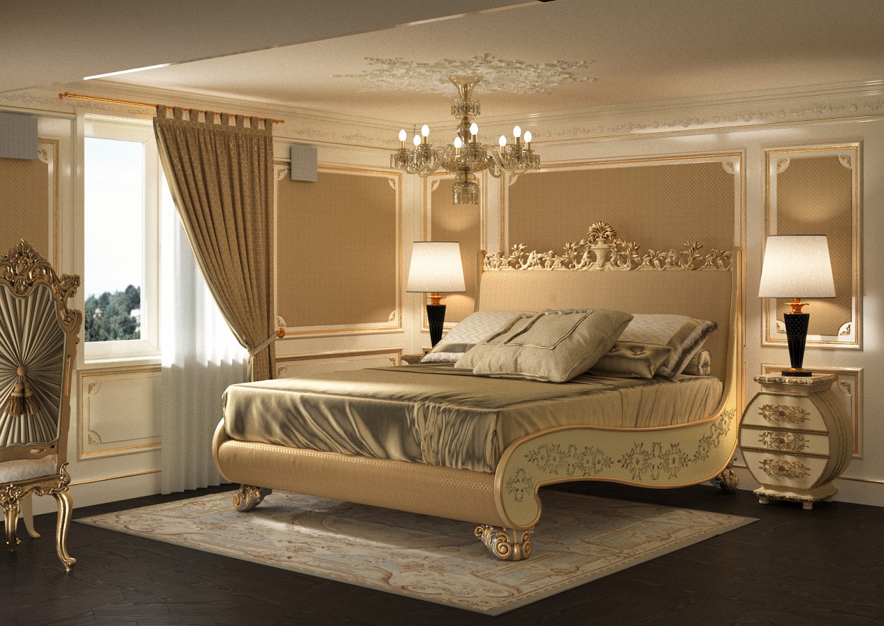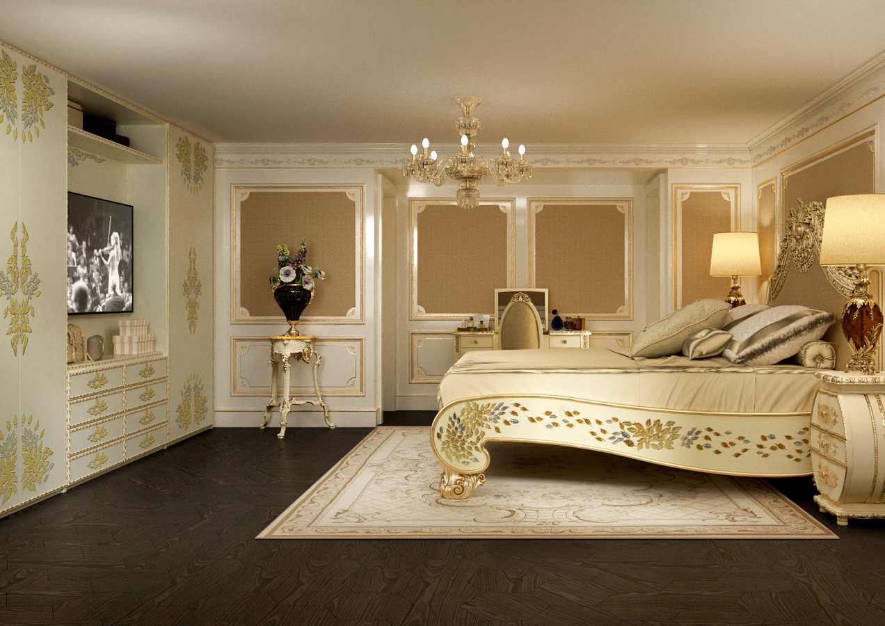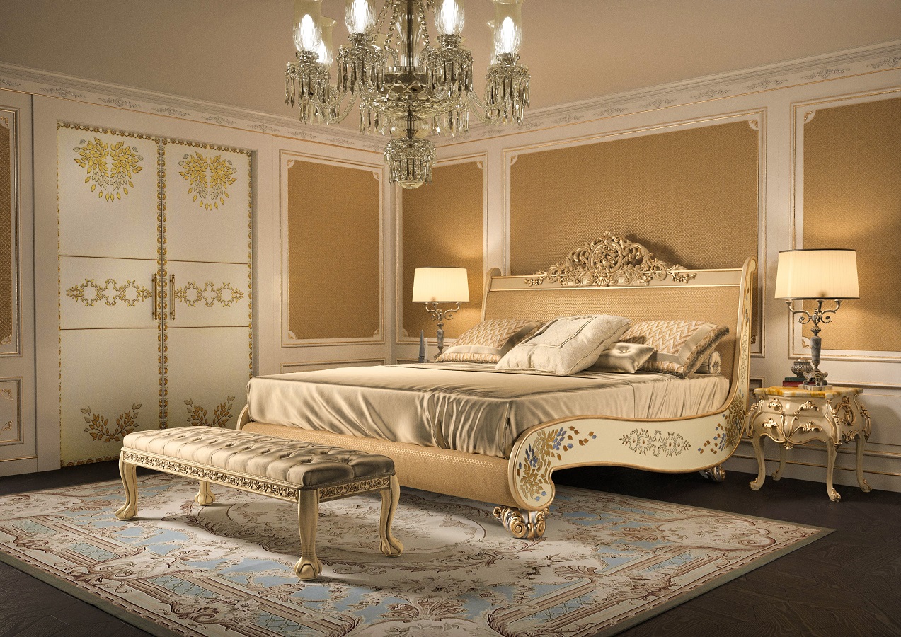 Nella zona notte, il letto Vanity domina la scena con le sue forme scultoree, coordinato con complementi che ne esaltano la lavorazione artiginale.