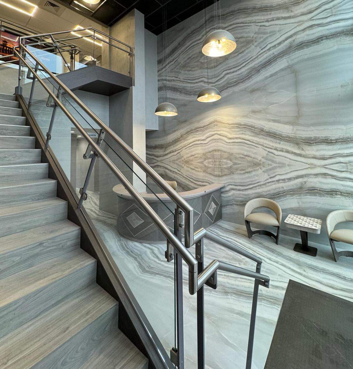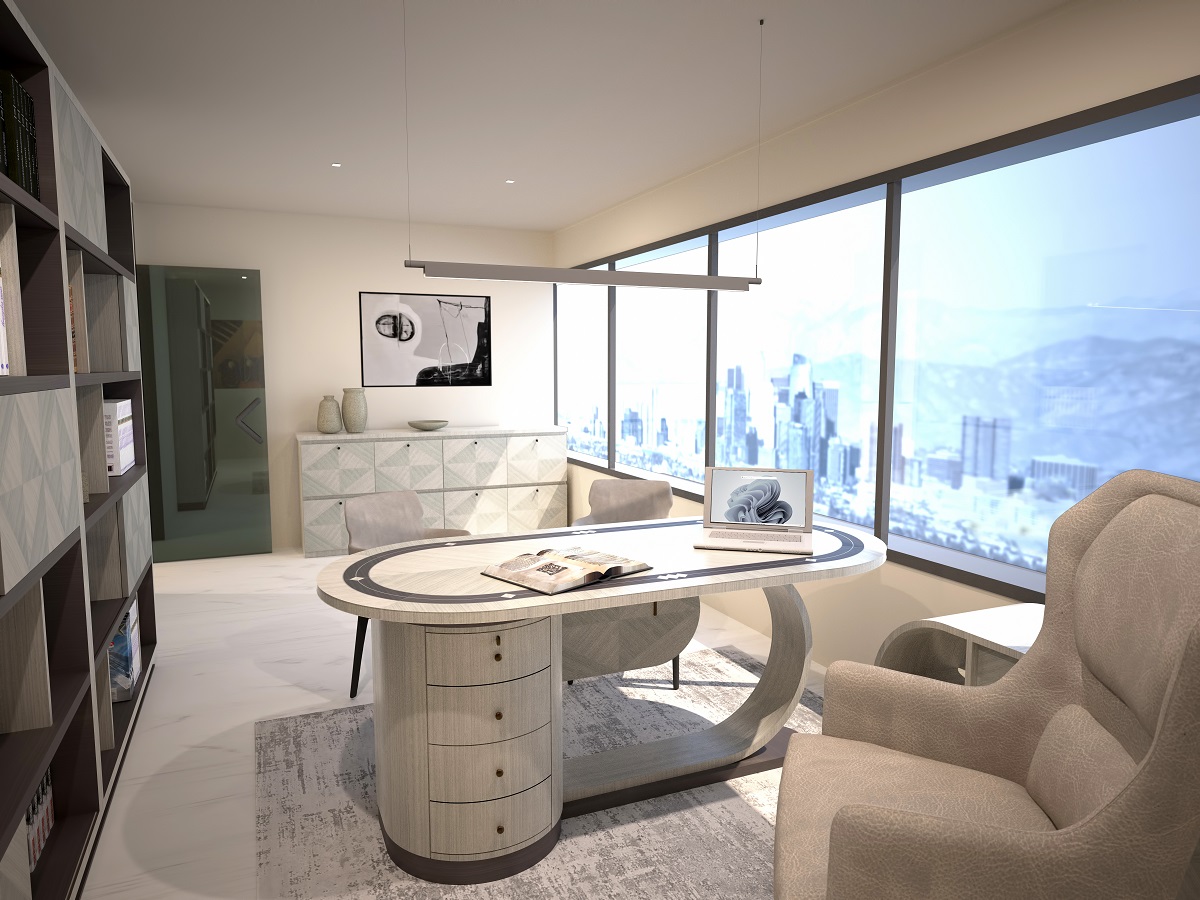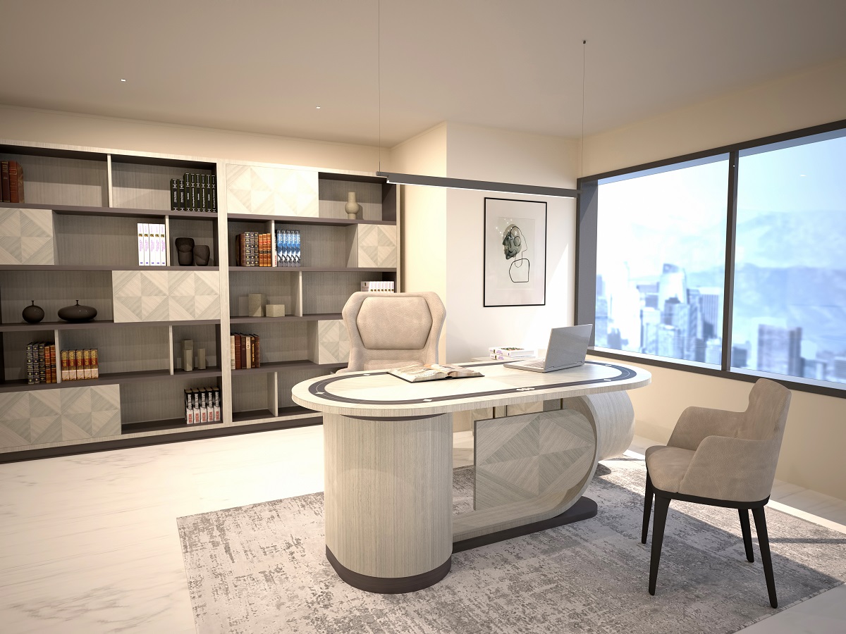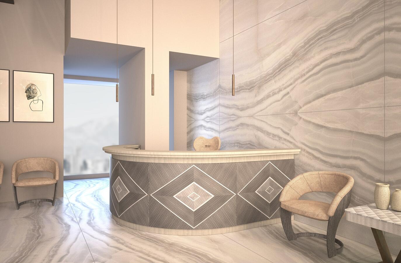 Spazi direzionali su misura in stile contemporaneo, tra eleganza e praticità. Boiserie, intarsi geometrici e materiali soft valorizzano reception, uffici e sale riunioni, riflettendo la prestigiosa immagine del brand cliente.
