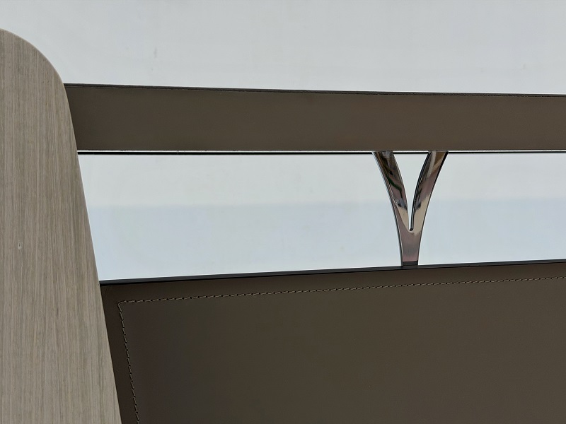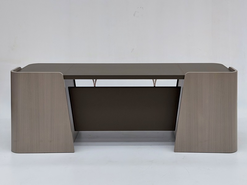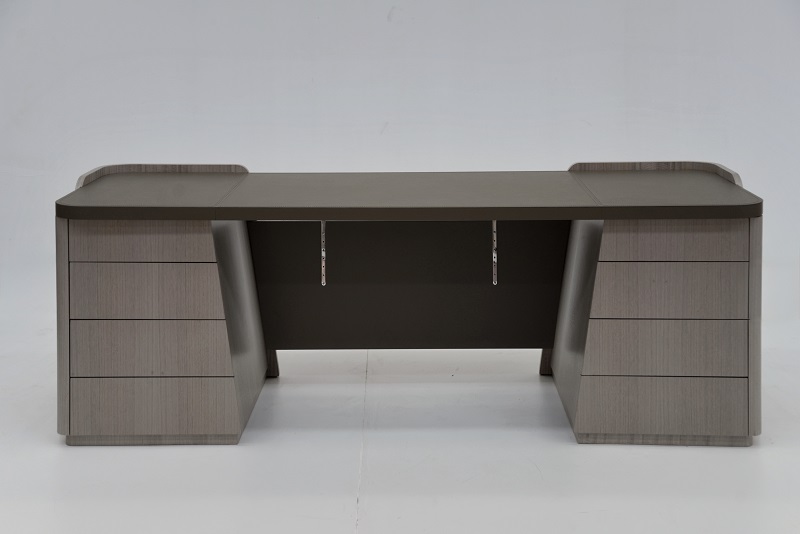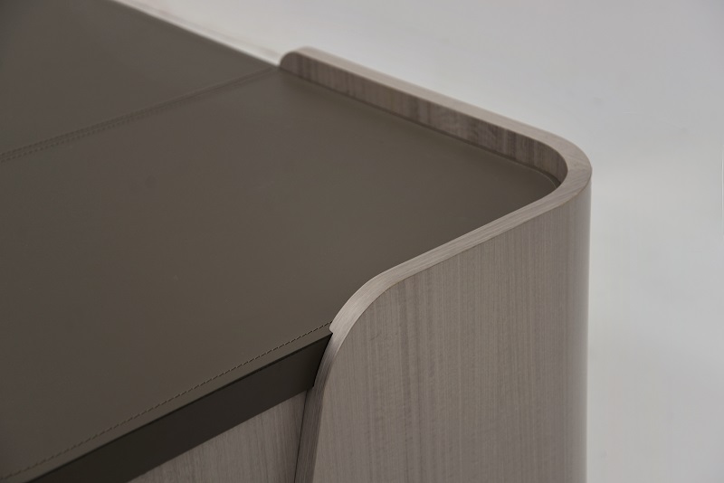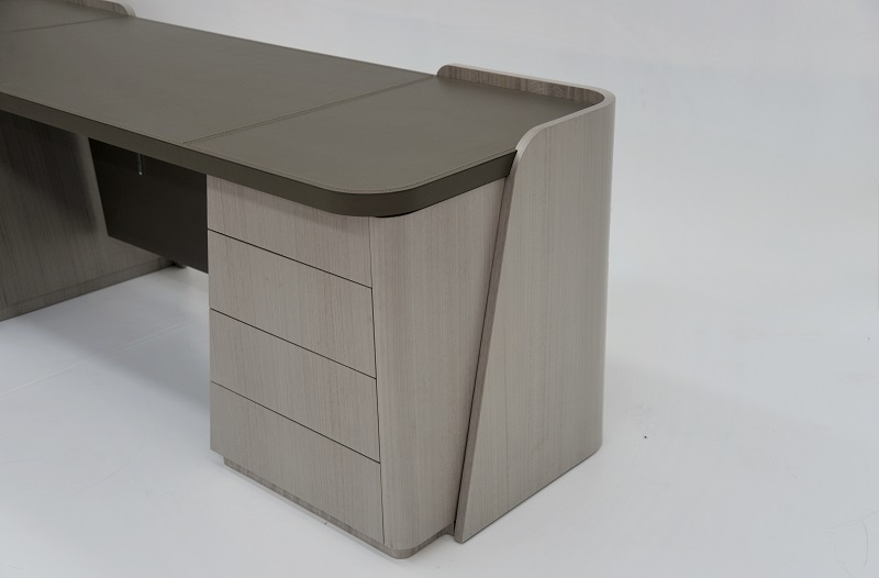 Scrivania direzionale Shape, dalle linee morbide e avvolgenti, arricchita da un elegante piano in cuoio con cuciture a vista, proposta nella finitura Eucalipto lino F130. Il paragambe è rivestito in cuoio, mentre i supporti in metallo satinato ne valorizzano l’estetica.