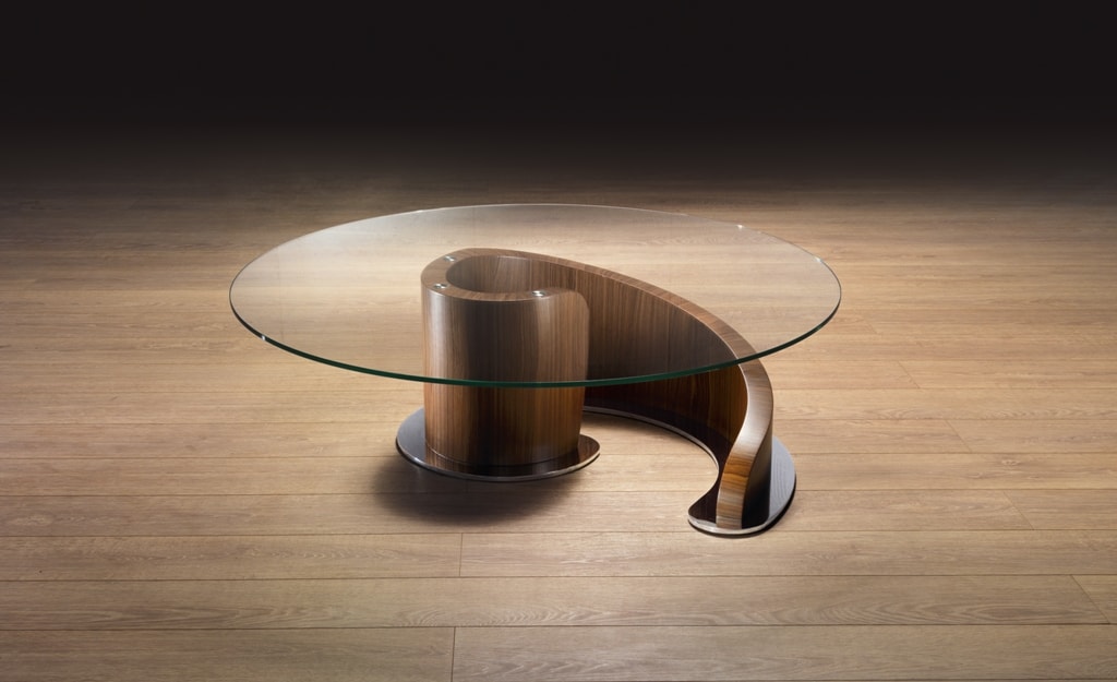 Tavolino da salotto con base a forma di chiocciola. La struttura è in noce Canaletto disponibile nelle finiture naturale con piano in vetro trasparente e base in metallo cromato (TL41) o nella finitura cioccolato con piano in vetro bronzato e base in metallo finitura bronzo satinato (TL41B).