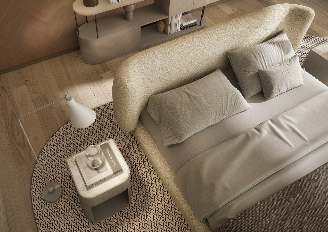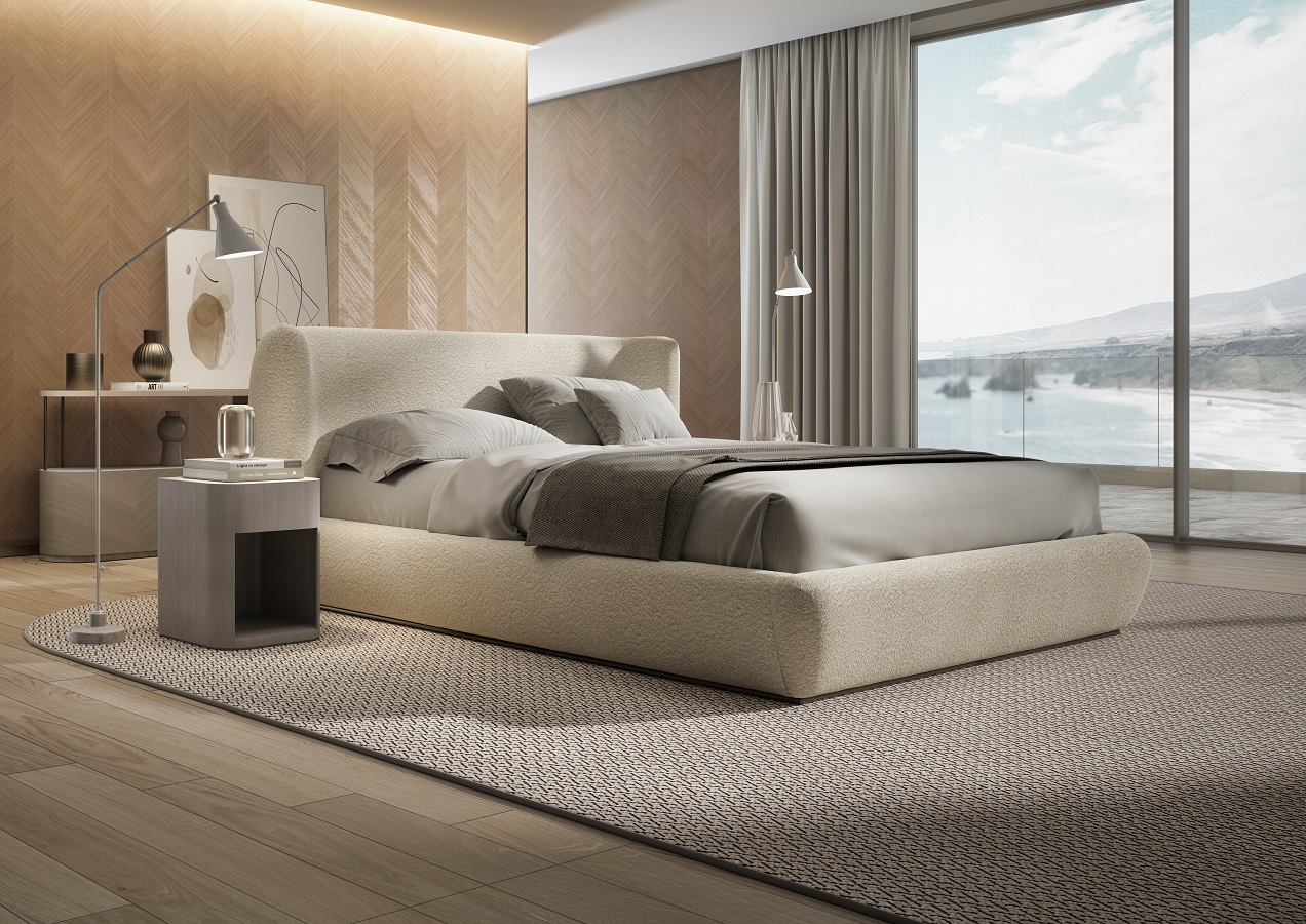 这款软包床以柔和的体块为特色,包覆材料可选织物、皮革或磨皮。
